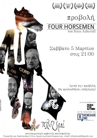 Οι προβολές στο Πλουμί ξεκινούν για το μήνα Μάρτιο και θα πραγματοποιούνται κάθε πρώτο Σάββατο του μήνα. Το Σάββατο 5 Μαρτίου στις 21:00 θα πραγματοποιηθεί η προβολή του "Four Horsemen" του Ross Ashcroft, παραγωγής 2012.
